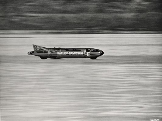 På Bonneville salt flats tæt ved Wendover, Utah, slår køreren Cal Rayborn verdensrekorden for hastighed på motorcykel. køretøjet er en 4,88 m cigarformet motorcykel drevet af en Sportster motor, og præsterer et gennemsnit på lige over 426 km/t.