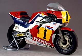 Designet til Freddie Spencer til '84 GP sæsonen, dette var den første NSR. Udstødningsrørerne er lagt hvor tanken normalt er.