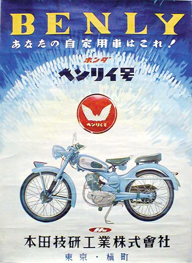 A poster for the first-generation Benly. Appearing with a 4-stroke engine and a new frame with pressed steel backbone, the Benly stumbled at its start but eventually became a highly popular model. (Poster courtesy of Honda Collection Hall.)