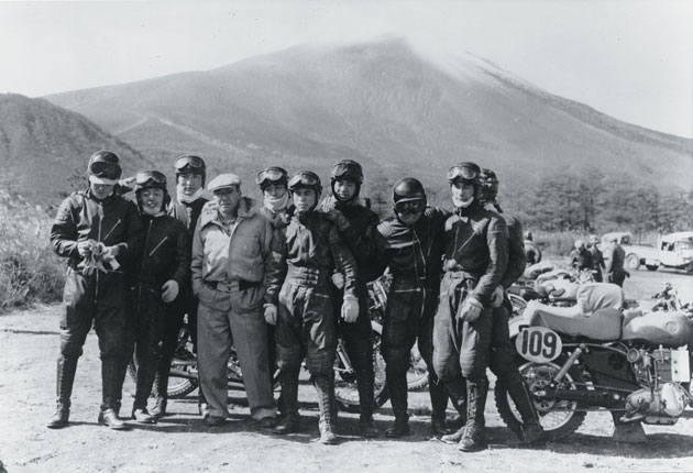 This photo shows Soichiro Honda (fourth from the left) posing with Honda riders as Mt. Asama looms in the background. |