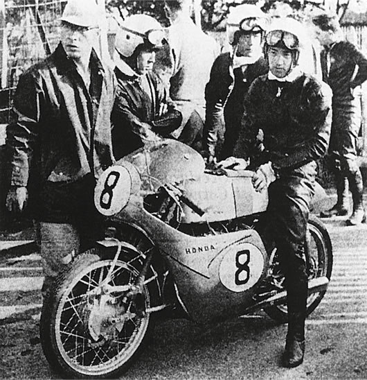 "When that declaration was made, I was wondering who would handle such a huge job," he said. "Then, it was given to me. We immediately started working on a prototype engine, which was finished by the end of the year. However, the Old Man was being troublesome, people all around us were being troublesome, everybody was telling us what to do, and the situation was a mess. I told them, please make us into a specialized unit or I won't go on with this, and the response was the simple, 'Do it!' We started what was called the Number 2 Research Section and brought in engine design men, body design men, assembly men, riders, and a team manager. We were attached directly to the top, with only the Old Man above us. this was after the second Asama race. The engine was handled by Tadashi Kume and Kimio Shinmura, and the body by Toshiji Baba, who had been on the verge of starvation in Scõo Paulo. The riders were members of the Honda Speed Club, an in-house organization created when we entered at Asama. In those days, we could decide things by asking a question and getting a show of hands, so I don't remember if we ever had any directives. So all of us, from the engine men on out, were nonconformists in one way or another," he added, laughing. "Anyone who was a respectable engineer wouldn't have considered getting into anything so reckless as competing in the Isle of Man TT Race. As for us, from the Old Man on down, none of us were respectable."