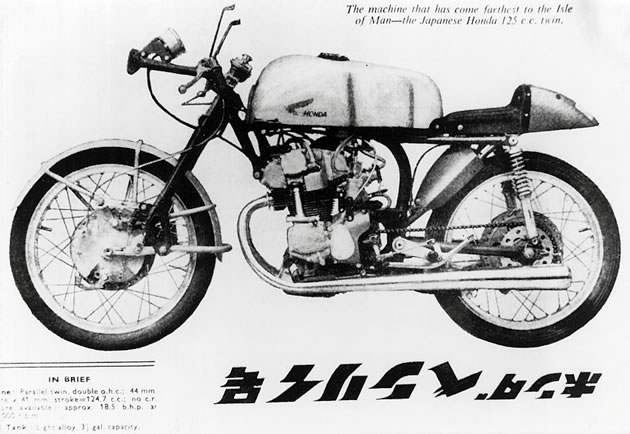 The Honda RC142 as introduced in the British motorcycle magazine Motorcycling. The name "Honda Benly" in Japanese is printed upside down at the bottom.