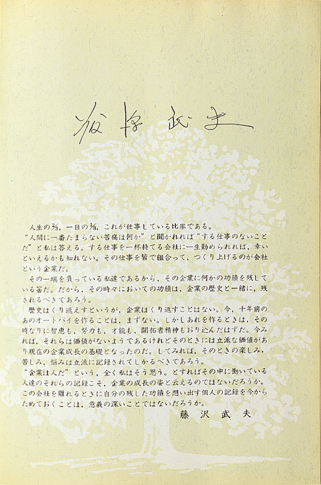 "Ultimately, I had no say in the matter, since you had created an organizational chart that was certain to result in prosperity for Honda Motor, thus bringing happiness to us all. It has taken fourteen long years to arrive at this point, from when I first hoped for such an organization. For fourteen years, all of us at Honda Motor have worked to create this organizational chart. I want you to take especially good care of it.... I would be ever so grateful if you could continue making it grow, and mend any areas that may prove lacking in one respect or another."