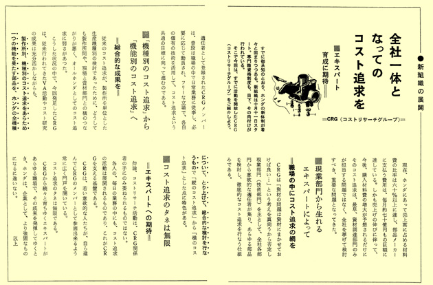The Honda company newsletter, No. 114 (November 1965) featured articles on CRG activities and discussed the goal of developing experts within the company.