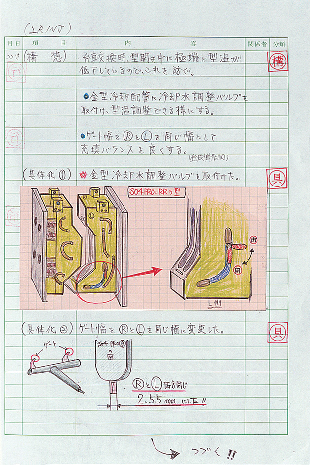 "I cut out and paste drawings from the improvement suggestion forms that have been returned to me," said Takenori Ao of the section, who organizes improvement suggestions in his own notebook. "Then I surround the drawing with questions and ideas for improvement. These are then categorized into questions, ideas and concepts to be recorded on a cumulative chart. When I discover comments written by our group leader in my notebook, it gives me great joy to know that my work has been acknowledged."