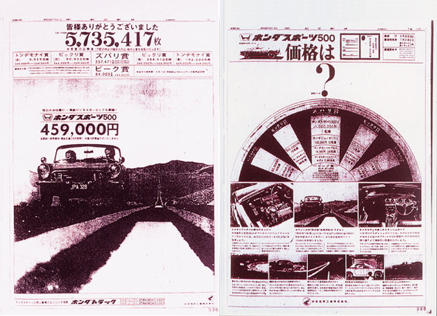 Honda’s newspaper ad for the Sports 500 Price Guess contest (right), and a subsequent article reporting the record 5.7 million entries (left) (Photo courtesy of Kyodo Advertising)
