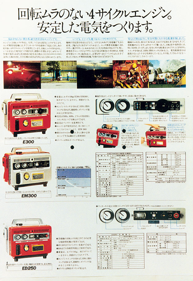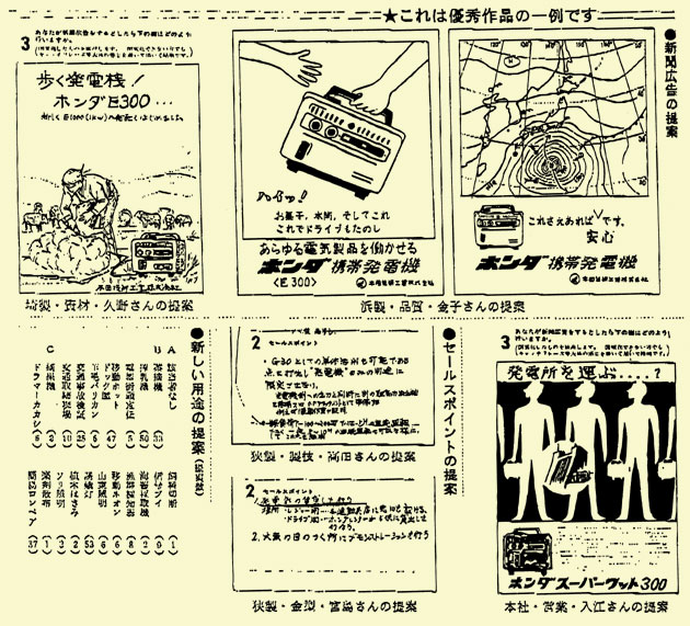 When the E300 was released, the employees were invited to send in ideas for the generator's application and newspaper ad. The most outstanding entries were published in the Honda company Newsletter (No. 116, issued in April 1966).