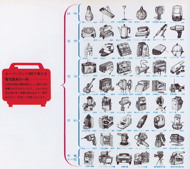 The initial product brochure introducing sample electrical appliances that could be used with the E300 generator.