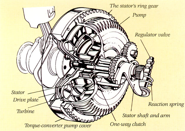 Perspective view of the torque converter. The stator’s reactive force is harnessed via the arm located on the right.
