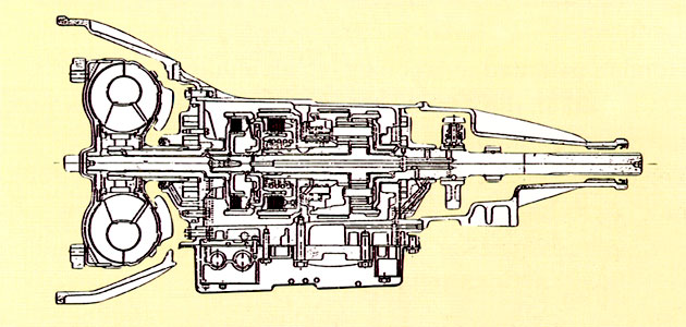 Perspective view of the BW35, BR’s mass-production automatic unit. The torque converter and planetary gears, respectively, are found at the left and in the center.