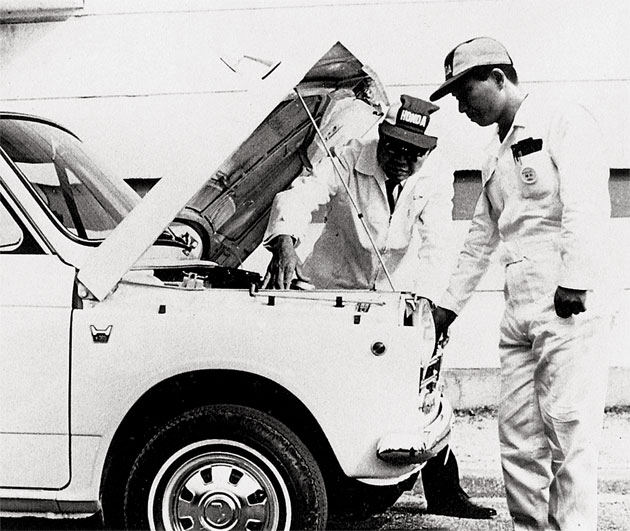Soichiro Honda (left) and Hattori inspecting N360AT before a test drive held at Wako R&D Center’s test course.