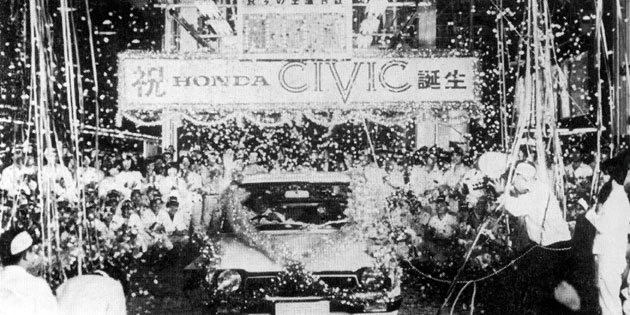 The line-off ceremony for the first-generation Civic in July 1972 raised the expectations of every Honda associate.