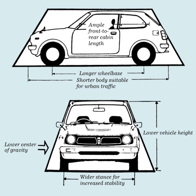 Honda’s planned retail dealership sales channel was a key factor affecting the dimensional constraints. At the time, most of the company’s associated dealers were small motorcycle shops. Thus, in order for those shops to carry the car, the interior passenger space had to be kept under 5 square meters.