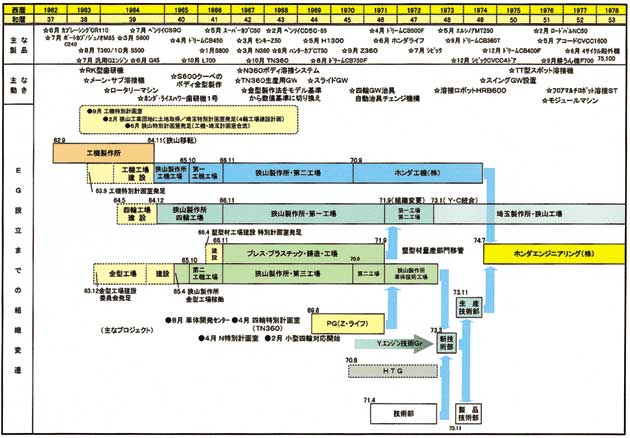 A new system was also established to divide various functions affecting the entire Honda group, and in that system, specific functions were laid out. Honda R&D would develop appealing new products, and EG would develop the appropriate production methods to make production feasible. Honda Motor would then ensure efficient production and sales operations.