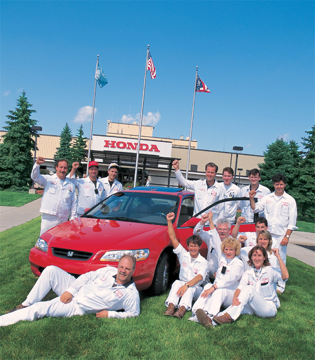 The promotion of four-polar global operations saw the simultaneous 1997 launch of Accords produced to local specifications. In the picture, associates at HAM surround the new Accord coupe, which was launched mainly through the efforts of Honda's American operations.