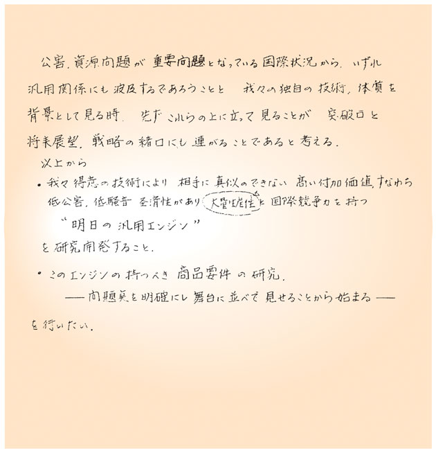 A plan document written in July 1974. The phrase 'a general purpose engine of tomorrow' reflects the determination of Honda's development staff. (Document courtesy of Hiroyuki Hatakeyama.)
