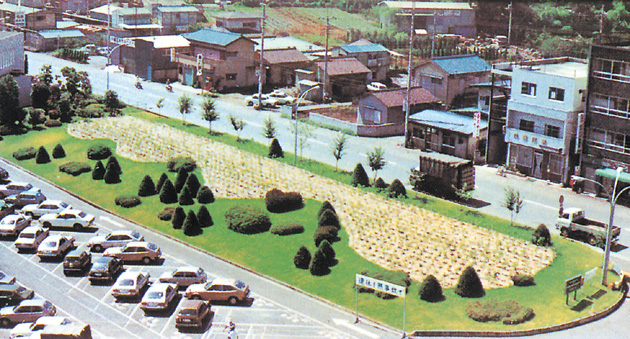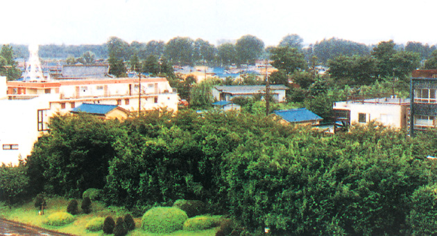 The front entrance of Saitama Factory's Sayama Plant in 1977, soon after the start of the Hometown Forest Project. The white area indicates sections covered with straw bedding in which the potted seedlings were planted.