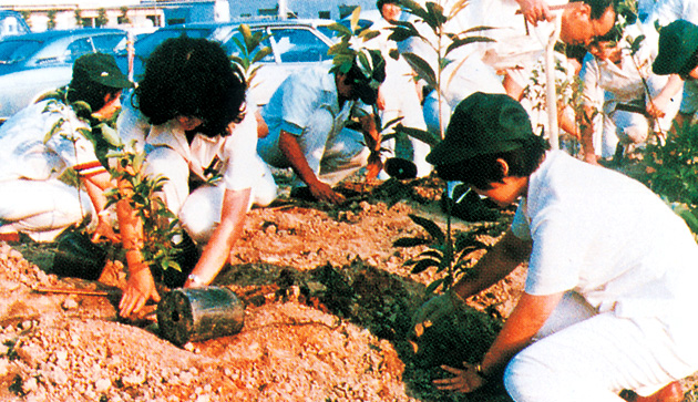 During the year 1977, 250,000 small seedlings, each grown in 10-em plastic pots were carried into the Kumamoto, Suzuka, Hamamatsu, and Saitama factories, as well as the research center at Tochigi. The seedlings were planted in various parts of the premises, sometimes by new employees and at others by groups of employees.