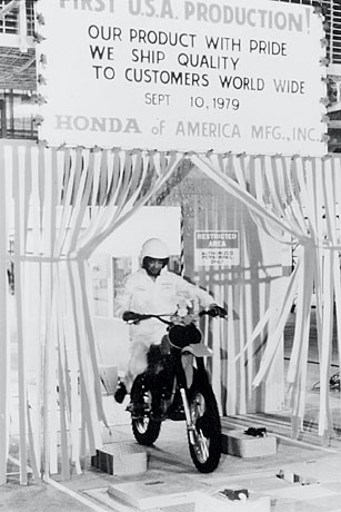 The CR250R, first of Honda’s motorcycles to be produced at HAM, rolled off the production line on September 10, 1979. Shown aboard the bike is Kazuo Nakagawa, HAM’s inaugural president.