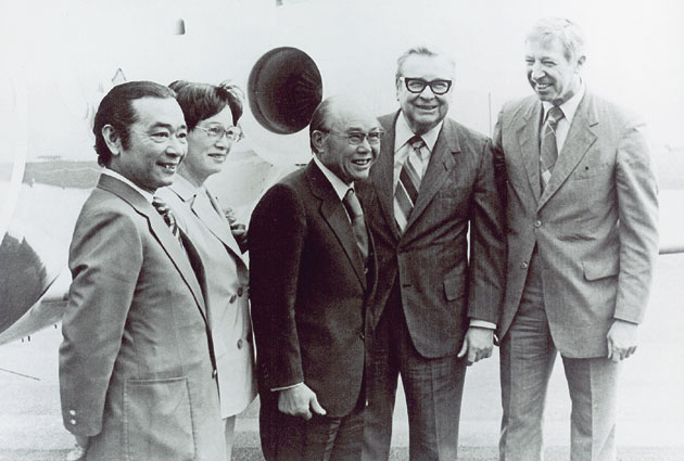 Soichiro Honda, his wife Sachi, and Kiyoshi Kawashima are greeted by Ohio Governor James Rhodes, second from right, upon their arrival at Columbus Airport to attend the ground-breaking ceremony for a new motorcycle plant. When an American reporter asked Mr. Honda why he had chosen Ohio, he answered, out of consideration for the many other states that had attempted to lure the company, “God led us to Ohio”.