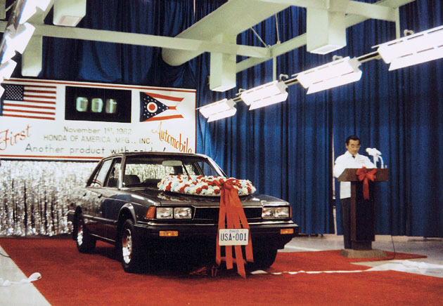HAM’s first Accord left the production line on November 1, 1980 . On the right is Kiyoshi Kawashima, proclaiming that the Japanese car-production facility built on American soil had rolled out its first vehicle. The car is now exhibited at the Henry Ford Museum, in Dearborn, Michigan.