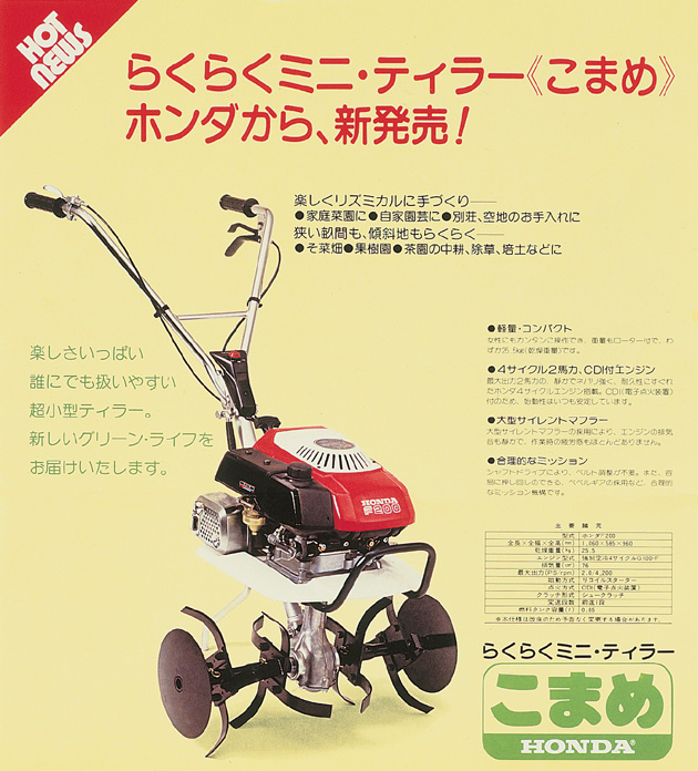 The F200 mini tiller, nicknamed "Komame," (meaning "diligent worker") nevertheless made its debut in March 1980, about a year after the project first started. It was the product of a devoted effort directed by Saito and his team, which involved experts in key components including engines, transmissions, frames and design. The company, however, had decided to test Komame's marketability by releasing it in limited markets in Japan. For this reason Komame's initial sales target was a mere 2,000 units, while the other new products all had five-figure targets. "It was as if the company had no interest in selling it," said Saito, laughing.