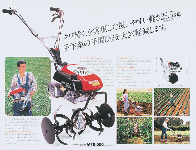 This was about the time that Honda launched its new ME general purpose engine, a model that was to make Honda Power Products the third pillar in a global marketing trio. Under the million-unit target set for the ME family of engines, one plan was initiated to develop a new product equipped with the G100 derivative. Gunji Saito, who for most of his career at Honda had been involved in the development of medium- to large-size cultivators, had been given the order to develop a mini-tiller.