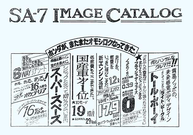 His first project was to create a report for presentation of the SA-7 to the entire company, especially the upper management. Rather than emphasize product features in the conventional way, however, he attempted to appeal to people’s senses using a freely styled form of expression. He then wrote down an outpouring of key phrases and ideas that conveyed his impression of the SA-7’s powerful impact. These concepts were then passed onto younger staff members in the Sales Promotion Division, where they could be expanded and refined. Important key words and catch phrases such as “Tall Boy,” “Light Vehicle,” and “Pocketeria,” which would later play a key role in promotional development, were issued at this stage. The SA-7’s image was taking shape.