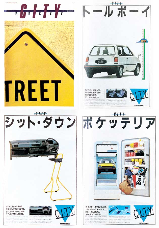 The logo chosen for the City featured the name in tall, capital letters, reflecting the image of the Tall Boy driving through the city between buildings, arranged with silhouettes of buildings behind them. The staffers also came up with the slogan, “The City is full of news,” enthusiastically conveying the product’s newsworthiness. The phrase actually had two meanings, one of which was modeled after the youth-oriented fashion district of Harajuku, then the location for Honda’s head office. The City was indeed a source of fashion and news.