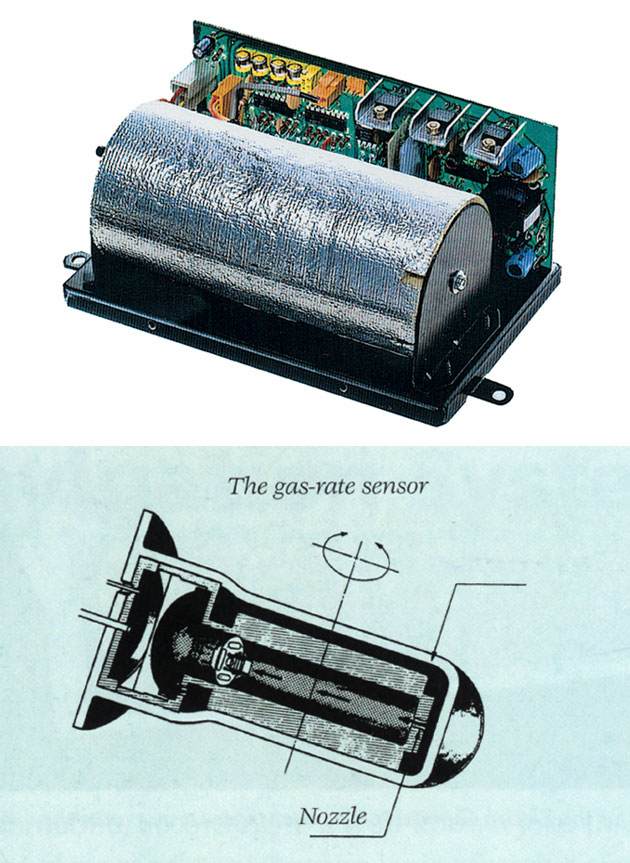 The gas-rate gyro works by using the inertial force of gas to move straight, employing helium ejected from a nozzle and blown onto two heated wires. The unit determines directional changes by sensing the temperature differences between the two wires. Therefore, this type of gyro, which employed just eight parts, was a very appealing candidate. However, it was not very accurate, and the zero point was often impossible to locate precisely. It was a problem for the development staff, but further study nevertheless identified certain benefits. As a result, the staff continued its research, hoping to develop a system that would offer reliable control, although within a limited range, along with constant zero correction.