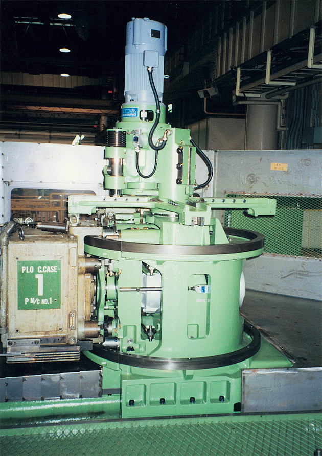 The development team was at the time busy designing a new gear train under Ida's supervision. The effort began as a tedious, manual process of drawing circles on the blade layout using a compass. Work efficiency was soon improved, however, with the development of original design software for gear trains, allowing the team to proceed to its next target. The changeover speed for ganged heads-which now weighed 500 kg, due to the gear train- was to be brought up to that of the machining center.