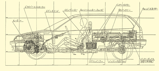 Layout plan of the first electric vehicle made by about 100 members from throughout Honda. It was based on the three-door Civic. The shame and regret the members experienced at the LPL's outrage after seeing this vehicle became the motivating force behind ideas and inventions for the future development of electric vehicles.