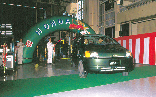 At the line-off ceremony to celebrate the first Honda EV Plus at Takanezawa Plant in April 1996. The vehicle gained national attention, with teams from five TV stations and ten newspapers covering the event.