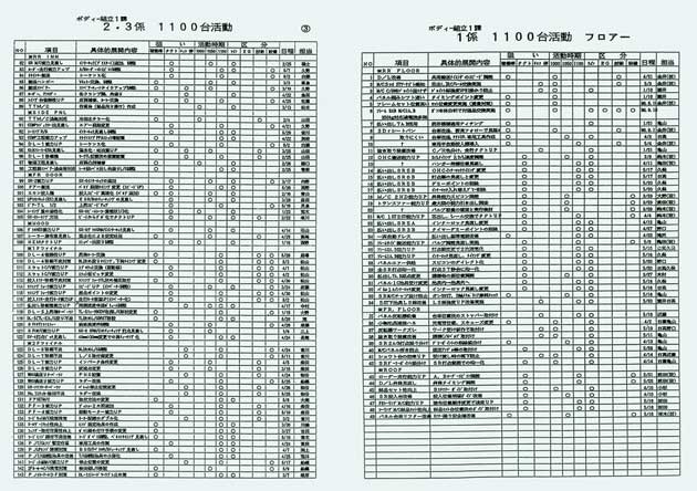 Checklists identifying the areas of improvement. Using these lists, young employees at Sayama Plant tackled the challenge of improving their own process. Efforts such as these resulted in several upward adjustments in production volume while minimizing new investments.