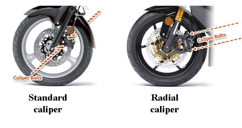 Den Radiale bremse caliper er som navnet antyder, radialt monteret (parallelt med bevægelses retningen). Det er en monteringsform der er endnu mindre fleksende end den fast caliper. Den har derved også en endnu bedre føling med bremserne. En anden fordel ved den radiale bremse caliper er, at du kan monterer størrer skiver på den allerede eksisterende caliper simpelthen ved at øge monterings afstanden på caliperen.