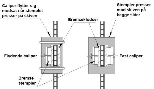 Bremse caliperne findes også i flere varianter: flydende caliper, fast caliper og radial caliper.