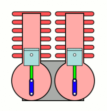 V-2 motorer der monteres som langsliggende (krumtappen parrallelt med stellet) har cylindre og topstykker stikkende ud til hver side, som Honda CX500 og Moto Guzzi, eller tværliggende som Harley-Davidson, Ducati, eller Aprilia. Den tværliggende V-2 med luftkøling, kan have problemer med at køle den bagerste cylinder og topstykke.