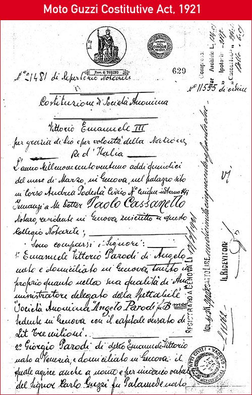 Den 15 Marts 1921, starter "Società Anonima Moto Guzzi" i Mandello del Lario, for at "Fabrikere og sælge motorcykler og andre aktiviteter relevant for eller associeret med metal- og den mekaniske industri".
