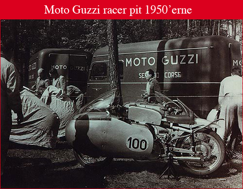 Præcis halvvejs gennem århundredet, blev den berømte Galletto født, den første scooter i historien med store hjul og en forløber for et concept der er blevet extremt populært i nyere tid. Så kommer den nye letvægts motorcykel Zigolo 98 fulgt af Lodola 175, det sidste projekt der var personligt designet af Carlo Guzzi i 1956. Tendensen til at være forud for sin tid kan ses i den konstante research i bedste design og konstruktions metoder. I 1950, som den første og eneste konstruktør i verden, byggede Moto Guzzi den første vind tunnel til at teste 1:1 skala prototyper, hvilket førte til udviklingen af den første moderne kåbe. Med denne nye detalje, overskred cyklerne 200 km/t og etablerede deres føreposition i alle race både på bane og på vej. Racer teamet var tæt knyttet og meget opfindsom, med teknikere som Umberto Todero og Enrico Cantoni arbejdende side om side med en designer der snart skulle blive legendarisk. Kun en dygtig tænker der ikke var bange for at drømme kunne finde på at sætte den imponerende otte cylindrede 500 cc motor på en motorcykel. Men Giulio Cesare Carcano lader sig ikke begrænse og Moto Guzzi's 500 V8 (otte cylindret) var en realitet, med dens 80 hk og 285 km/t. Ingen ville igen prøve med så stort et antal cylindre på en MC, en klar demonstration af Moto Guzzi teknologiske overmagt. Cyklen demonstrerede med det samme en stærk personlighed og et stort temperament, da den vandt sine første løb, og det var firmaets beslutning om at trække sig fra race, der afgjorde dens skæbne.